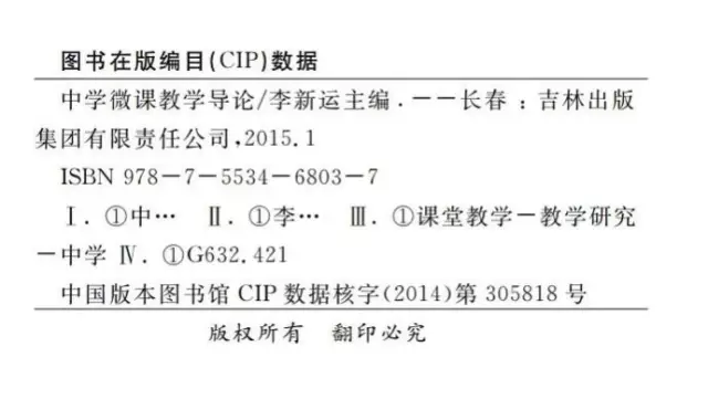 CIP全称是“图书在版编目数据”,它是英文 Cataloguing In Publication的缩写。指依据一定的标准,为在出版过程中的图书编制书目数据,经图书在版编目产生并印刷在图书主书名页背面或版权页上方的书目数据。CIP数据是由中国版本图书馆数据中心统一发放的数据,规定了图书在版编目数据的内容和选取规则及印刷格式,包括书名、作者、出版社、版本等。